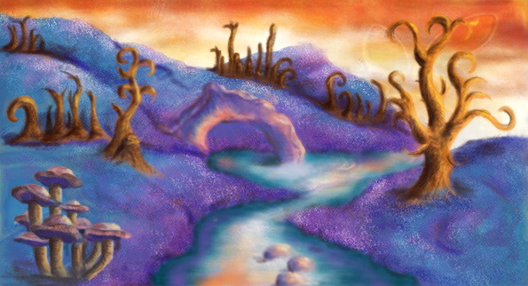 To create a matte painting of a scene or a fantasy movie or story. Using bright colors to give a childish look.